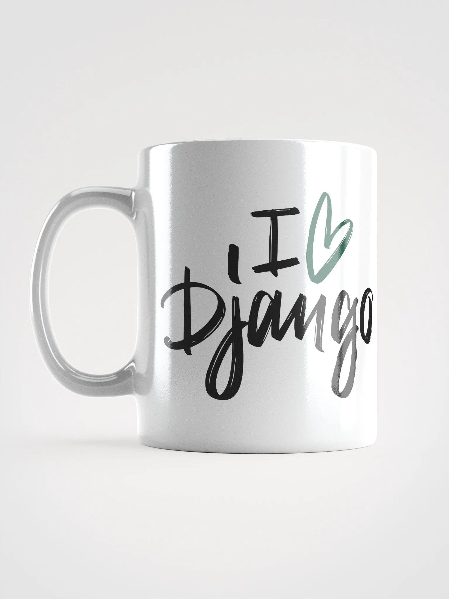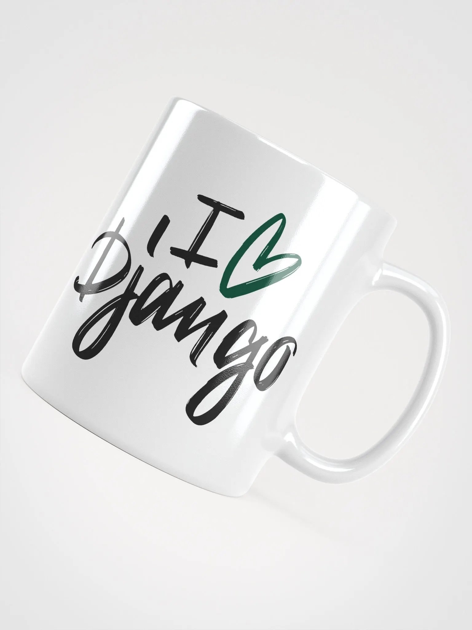 This is a white mug with the words "I Love Django" as a hand-lettered design on it.