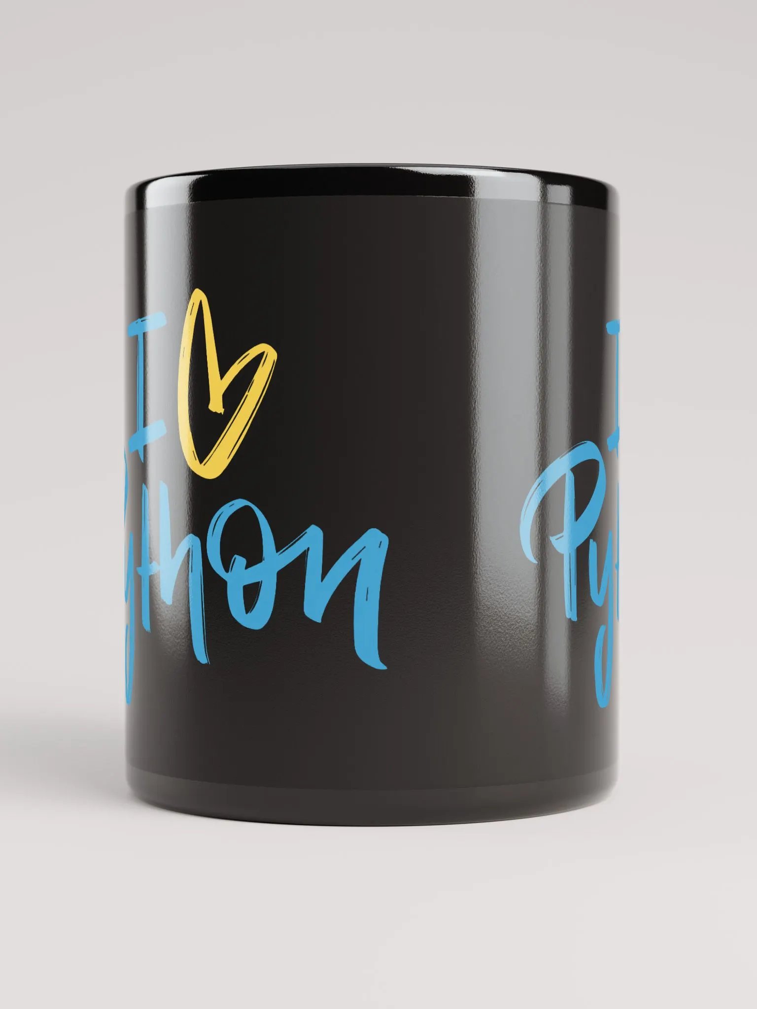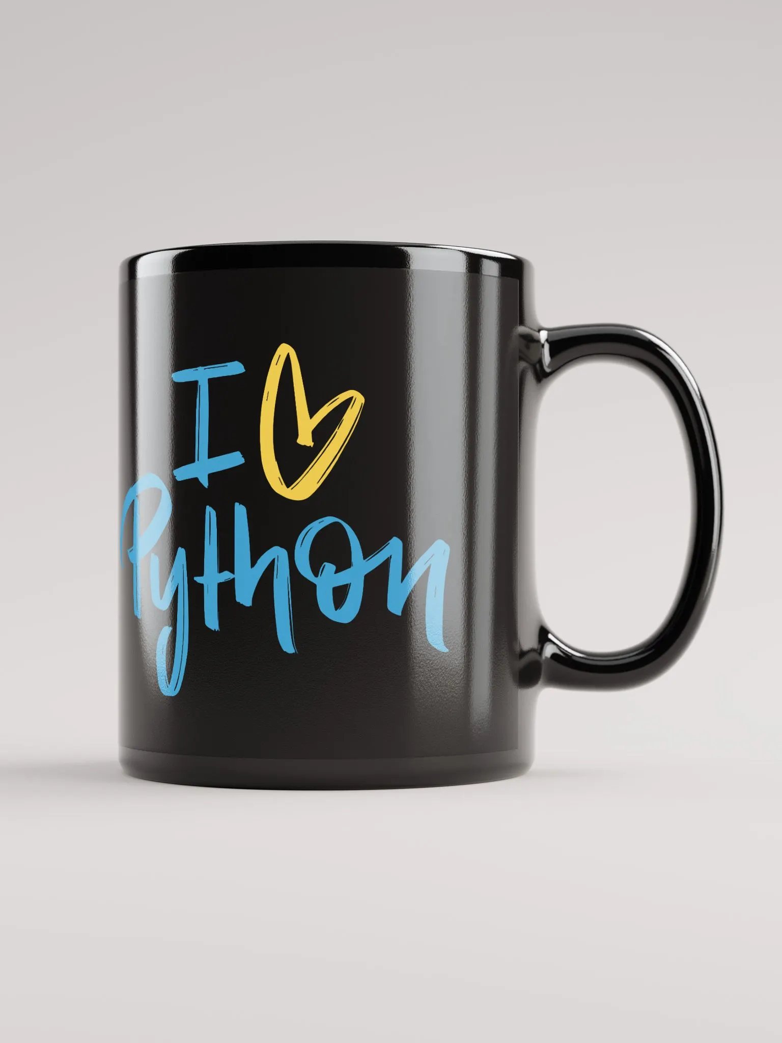 This is a black mug with the words "I Love Python" as a hand-lettered design on it.